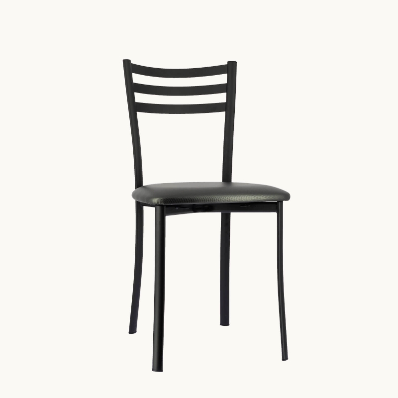 J'ai ce modèle de chaises de cuisine depuis environ 18 ans, et je les connais donc bien. Elles sont solides, esthétiques, et la garniture en simili cuir est confor ... table. Les patins en solide plastique sous les pieds permettent d'éviter le bruit et les rayures au sol. La finition métal mat se marie très bien avec mon mobilier métal et blanc. Le gros avantage est qu'on peut changer les coussins en simili quand on veut. De 6 chaises à l'assise noire à l'origine, j'ai progressivement acheté plusieurs couleurs commandées chez 4-Pieds, ce qui a à la fois donné un coup de jeune avec des assises neuves, et un coup d'originalité avec différentes couleurs. Le changement est très simple, à l'aide de 4 vis. Le coût de ces assises seules est raisonnable. Ce qui est également très appréciable est que le modèle est suivi depuis plusieurs années. En cas d'agrandissement de la famille, nul besoin de changer toutes ses chaises. Il suffit d'acheter la même individuellement, avec l'assise de la couleur souhaitée. Le cadre et l'assise sont livrés séparément, très bien emballés, à assembler soi-même.