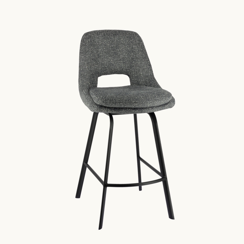 Olivier, est un tabouret de hauteur snack qui incarne l'élégance contemporaine. Sa silhouette épurée et son caractère unique se distinguent par un ajour à la base de son dossier, qui apporte une touche de légèreté. Habillé d'un tissu disponible en plusieurs coloris et d'élégants pieds en métal noir, Olivier s'intègre avec finesse dans tous les univers décoratifs. Son assise et son dossier généreusement rembourrés garantissent un confort remarquable, vous invitant à la détente lors de vos pauses gourmandes ou vos instants de partage. Sa hauteur snack lui permet d'être associé à des tables ou des îlots d'environ 90 cm de haut. Certifié par la norme NF EN12520, il est également gage de sécurité, résistance et durabilité !