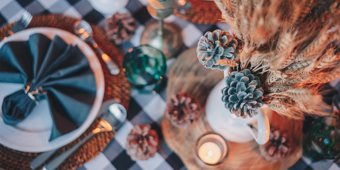 Parmi les éléments naturels qui s’invitent dans votre décoration d’automne, la pomme de pin effectue son grand retour. Sur la table, disposez-en plusieurs selon vos envies afin de relever votre décoration. Cette idée est facile à mettre en place puisqu’il suffit d’une petite balade dans les bois pour décorer votre table de façon économique. Pour les adeptes du DIY, vous pourrez ensuite décider de les colorer ou non à l’aide d’une peinture adaptée. Des pommes de pin dorées ou argentées feront sensation sur votre table de saison.