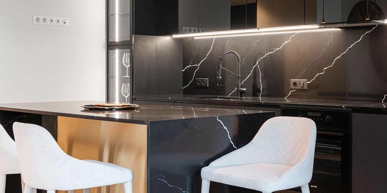 - Les meubles plus modernes, qui mêlent les matières comme le Dekton, le marbre et le bois.